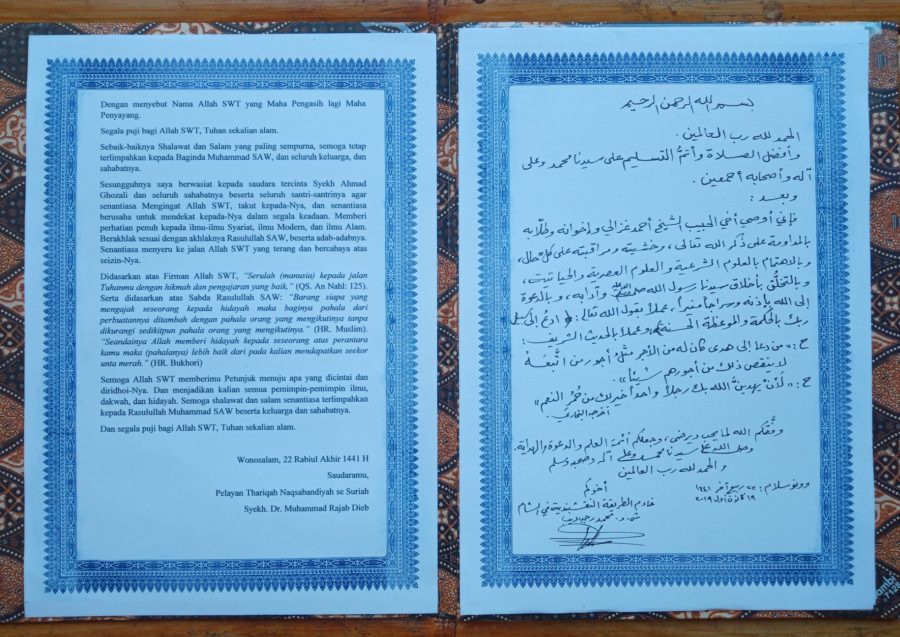 Dalam silaturrahim tersebut, Syekh Muhammad Rajab Dieb menuliskan wasiat kepada kami, sahabat, dan seluruh santri (terlampir). Semoga Allah SWT senantiasa memberikan kekuatan dalam menjalankan amanah wasiat ini. Aamiin…